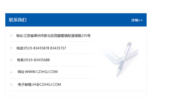 地址:常州市新北區友邦商務大廈1幢16、17層  電話:0519-85101652  傳真:0519-85112595  郵編:213022  網址:www.cz-jiayue_cn.nanyuan2008.com  郵箱:xiajifengaa@163.com